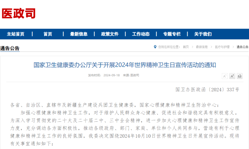 国家卫生健康委办公厅关于开展2024年世界精神卫生日宣传活动的通知