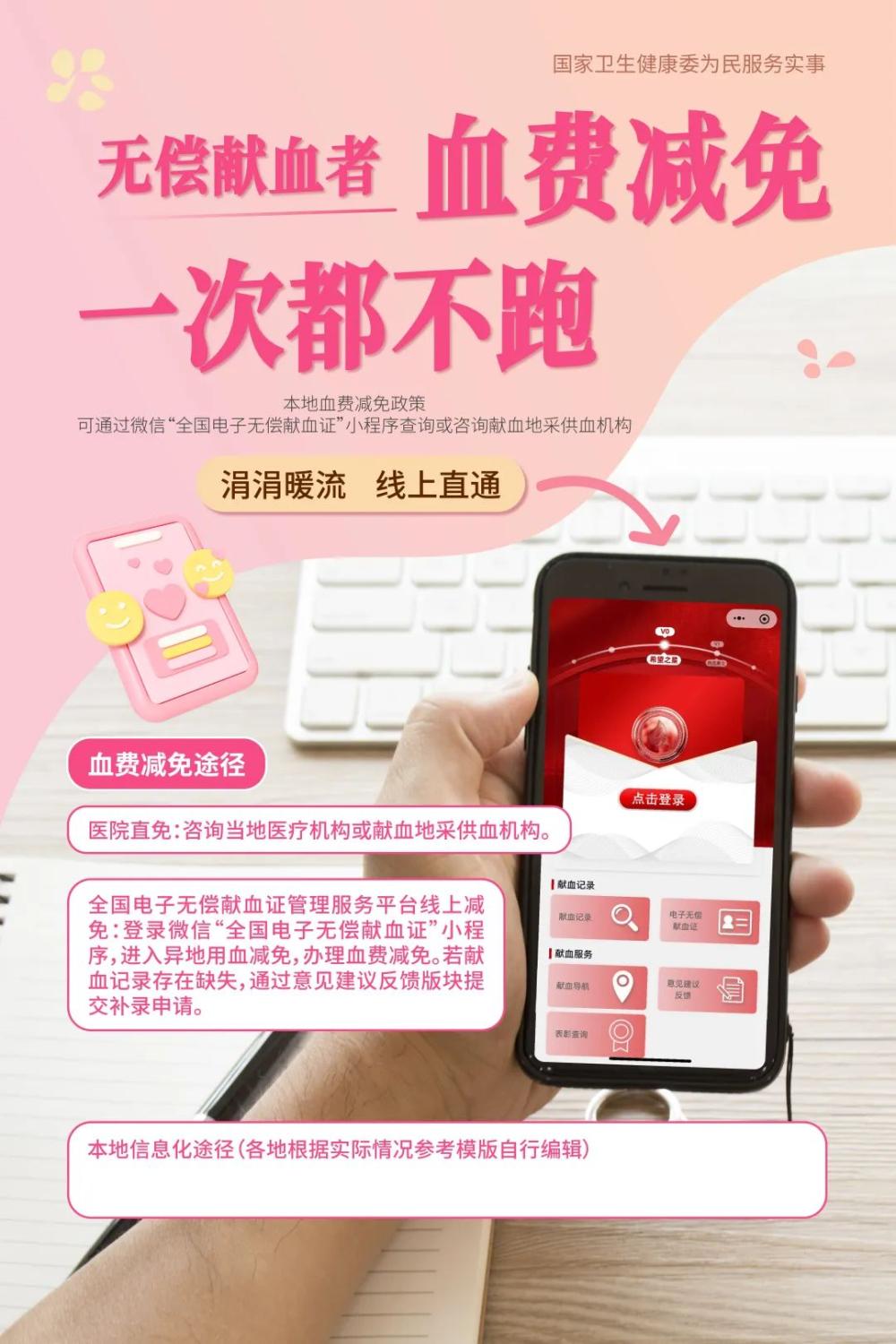 国家卫生健康委依托微信“全国电子无偿献血证”小程序,已建成全国血费跨省异地减免平台(以下简称全国平台),实现无偿献血者无论何地献血、何地用血,均可线上办理血费减免。