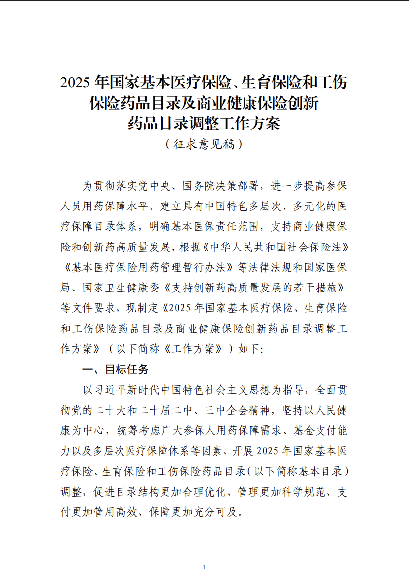 近日,国家医疗保障局发布《2025年国家基本医疗保险、生育保险和工伤保险药品目录及商业健康保险创新药品目录调整工作方案(征求意见稿)》,将对基本目录中成药进行调整,并将新增商业健康保险创新药品目录。