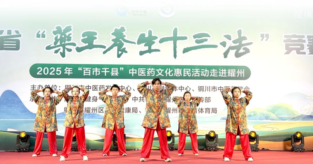 陕西省“药王养生十三法”竞赛也在耀州区举办,12支队伍现场展演“药王养生功”,伴随着悠扬的音乐,各参赛队员动作整齐划一,气韵流畅,将养生功的精髓展现得淋漓尽致。