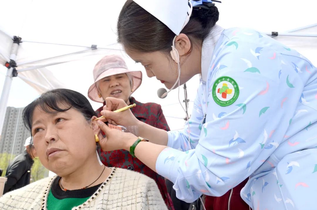 中医医院医护人员为百姓耳穴压豆。